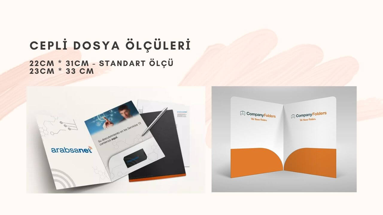Daha önceleri standart bir ölçü ve baskıda bulunan cepli dosyalar son yıllarda büyük bir değişim geçirmiş, klasik tasarımların haricinde firmaya özel tasarımlara yer verilmeye başlanmıştır. Firmamız güçlü altyapısı ve donanımları ile her türlü dosyayı sizin için hazırlayabilmekte. Dilediğiniz modellerimiz arasından seçim yapabilir ya da kendi beğendiğiniz modelin firmamız tarafından baskılanıp kurumunuza özel üretilmesini talep edebilirsiniz. Uzman ekibimizle birlikte bizler istediğiniz tasarımları sizler için hazırlayabiliyor, üretim süreçlerinin her aşamasında sizlere detaylı bilgi veriyoruz. Kağıt bilgileri, baskı teknikleri gibi her detayı onayınıza sunuyor, taleplerinize göre her bütçeye uygun cep dosyalar oluşturabiliyoruz. Birinci sınıf baskı teknikleri uyguluyor, model ve renk açısından hiçbir sınırlandırmada bulunmuyoruz. Sürecin sonunda istediğiniz cepli dosyaları tam da istediğiniz gibi karşınıza çıkarıyoruz. Gerek kendi kurumunuzun içerisinde personelleriniz tarafından kullanılabilecek gerekse müşterilerinize hediye ederek gönüllerini mest edebileceğiniz çözümler geliştiriyoruz.